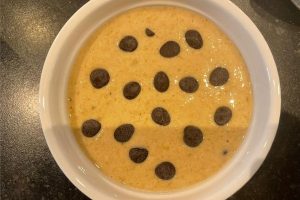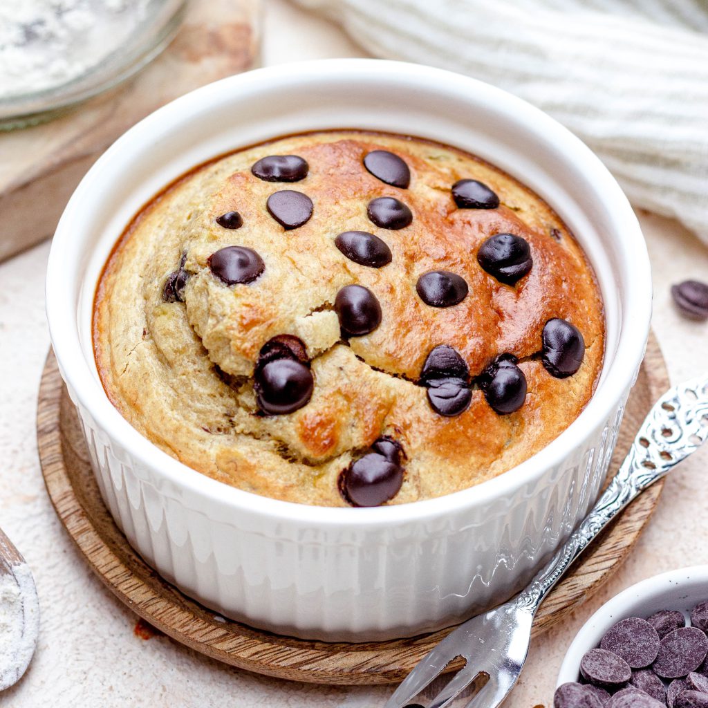 4. Doe het beslag in een ovenbestendig schaaltje en verdeel wat pure chocolade stukjes er overheen.