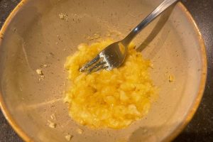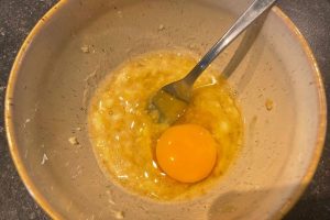 3. Meng de geprakte banaan met het ei, de amandelmelk en maple syrup. Roer daarna het havermeel en bakpoeder er door.