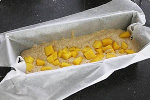 7. Giet de rest van het beslag er over en verdeel de laatste stukjes mango over de bovenzijde.