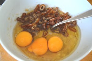 3. Voeg hier de kleine stukjes dadels aan toe en de eieren. Meng dit goed door elkaar.