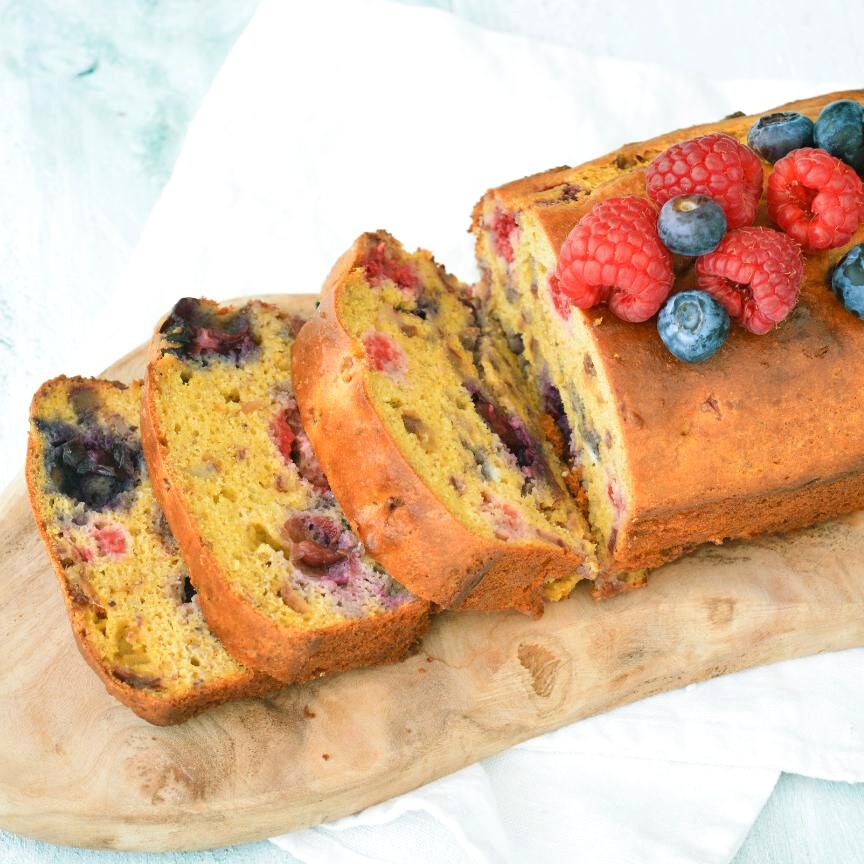 5. Meng als laatste de frambozen en blauwe bessen door het beslag toe.