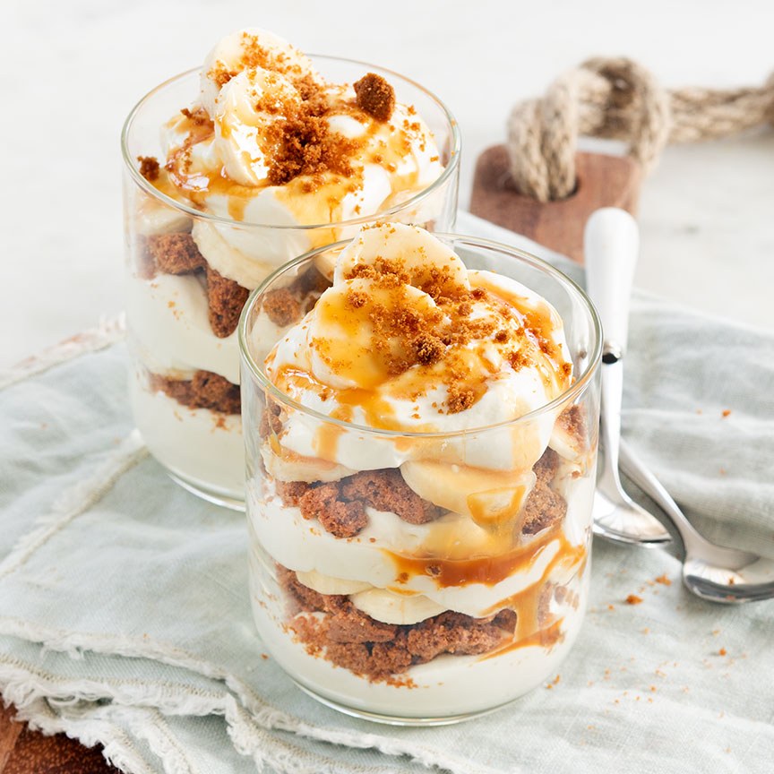 4. Serveer dit banoffee in een glaasje toetje direct of bewaar maximaal 1 dag in de koelkast.
