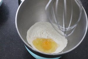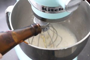 1. Bak de spek krokant in de pan en laat uitlekken op een keukenpapiertje. Doe de bloem, zout en suiker in een kom en meng door elkaar. Voeg ei toe en mix er langzaam door. Giet beetje bij beetje het bier er bij.