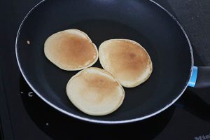 2. Verhit een beetje boter, gebruik niet te veel. Schep 2 of 2 sauslepel beslag in de pan in hoopjes en bak 2 minuutjes tot ze goudbruin zijn en er belletjes te zien zijn aan de bovenzijde. Draai om en bak ook de andere kant bruin. Herhaal met de rest van het beslag en stapel de pannenkoekjes op. Snijd of breek de spek in stukjes en verdeel over de pannenkoeken. Schenk er en beetje stroop over.