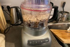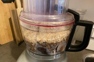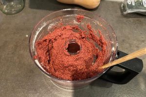 8. Voeg de linzen en bietjes allebei toe aan de keukenmachine en doe als laatste de walnoten en havermout erbij. Mix het tot een dikke roze massa. Is het mengsel te plakkerig? Voeg dan extra havermout toe en mix het nogmaals in de keukenmachine.