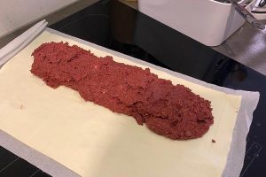 9. Verdeel het mengsel in een lange strook over het bladerdeeg. Zorg ervoor dat je voldoende ruimte overhoudt aan de zijkanten, zodat je het dicht kunt vouwen.