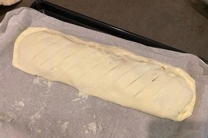 11. Besmeer het bladerdeeg met een beetje plantaardige melk en snijd daarna wat strookjes in de bovenkant.