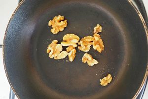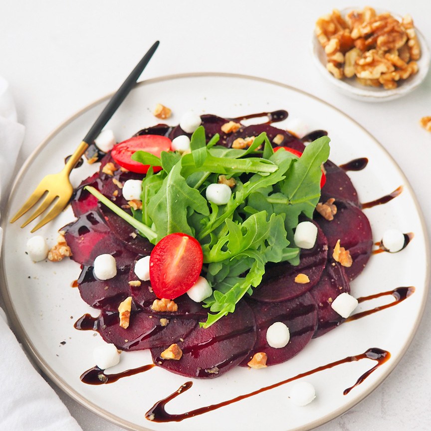 4. Verdeel de plakjes rode biet over 2 bordjes en verdeel hier wat rucola over. Maak de bietencarpaccio af door de balsamico crème, de walnoten, geitenkaas en cherry tomaten erover te verdelen.