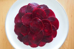 1. Snijd de rode bieten in hele dunne plakjes. Dit kun je met een scherp mes doen of je kunt gebruik maken van een mandoline of kaasschaaf.