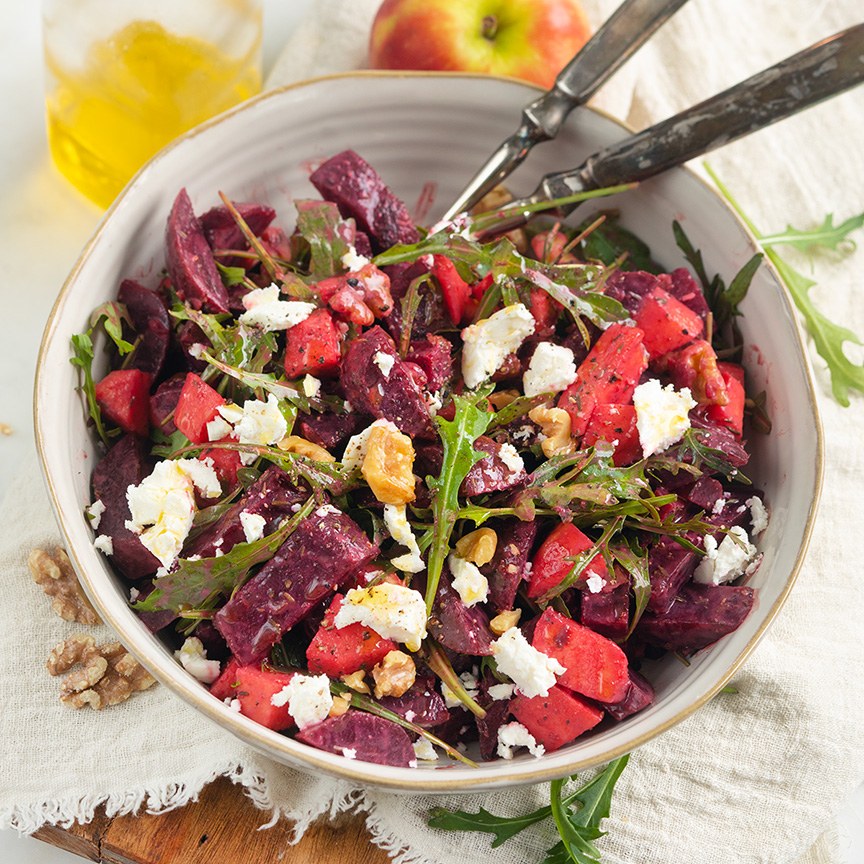5. Tips: bewaar de bietensalade in de koelkast en voeg het liefst pas de rucola vlak voordat je het gaat serveren toe zodat deze niet verlept.