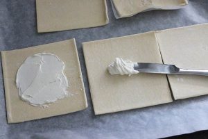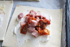 1. Verwarm de oven op 200 graden. Snijd de zongedroogde tomaatjes in stukjes. Neem een plakje bladerdeeg en voeg in het midden een eetlepel roomkaas toe en smeer dit wat uit. Verdeel vervolgens een deel van de zongedroogde tomaatjes en ham blokjes er overheen. Vouw vervolgens alle punten naar binnen, met een beetje speling tussen de randjes.