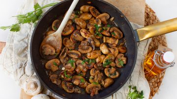 2. Snijd de champignons in kleine stukjes en snipper de knoflook. Fruit de knoflook aan in een pan met een beetje olie. Voeg de champignons en fijngehakte peterselie toe en bak een paar minuten tot ze flink geslonken zijn. Mocht er nog veel vocht in de pan zitten dan kun je de champignons even uit laten lekken in een zeef. Breng het champignonmengsel op smaak met peper en zout.