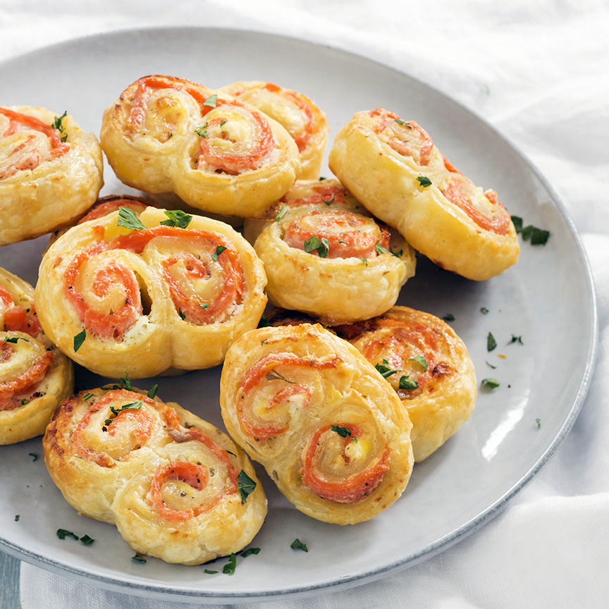 2. Snijd de rol daarna met een scherp mes in dunne plakjes en leg deze op de bakplaat met bakpapier. Klop het halve ei los en bestrijk de bladerdeegrolletjes hiermee. Bak de bladerdeegvlinders met zalm in ongeveer 15 minuten goudbruin en laat ze daarna afkoelen.