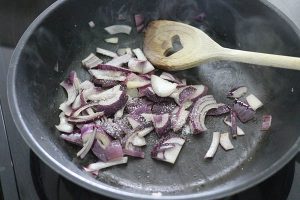 3. Snijd de ui grof en smelt de boter in een pannetje. Bak de ui 2 minuutjes en doe dan de suiker en balsamico azijn erbij en laat de ui licht karameliseren en de azijn iets inkoken.