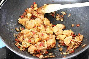 2. Snipper de ui, rode peper en knoflook fijn. Fruit deze aan in een pan met een beetje olie. Voeg de komijn en ketjap toe. Voeg de kip in kleine stukjes toe en bak een paar minuten mee tot hij bijna gaar is. Schep dan de roerbakgroenten, bosui er door en de bloemkoolrijst.