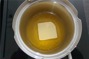 2. Smelt de boter op laag vuur. Schenk over in een schaaltje en laat afkoelen in de koelkast. Deze moet niet té warm zijn als je dit bij de rest van de ingrediënten doet, anders gaan de eieren stollen.