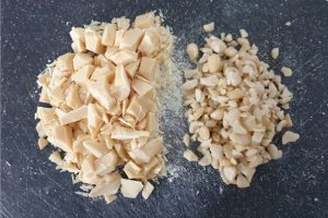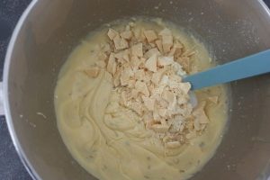 4. Hak de chocolade en de macadamianoten in kleine stukjes. Spatel (niet mixen) deze door je mengsel heen.