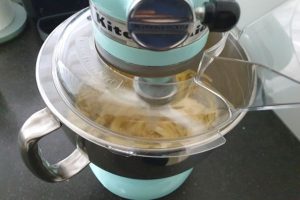3. Neem een grote kom waar je alle ingrediënten in gaat mixen. Zet deze op je weegschaal en voeg de bloem, basterdsuiker, kristalsuiker, vanille extract, de eieren en de lavendel toe. Zodra de boter is afgekoeld, voeg je deze ook toe. Mix voor ongeveer 5 minuten en schraap tussendoor een keer het beslag dat aan zijkanten van je beslagkom is gaan zitten eraf en door je beslag heen.