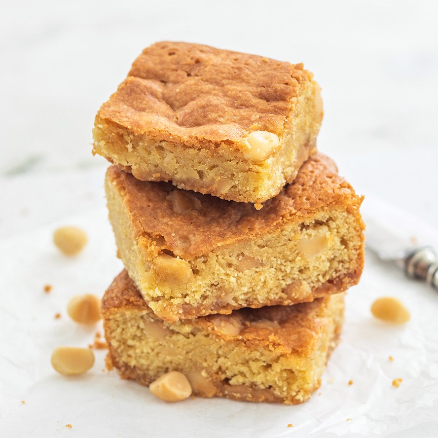 4. Bak de blondies ca. 30 minuten in de oven. Laat de blondies nog 10 min met de ovendeur open in de oven staan. Laat ze daarna afkoelen naar kamertemperatuur.