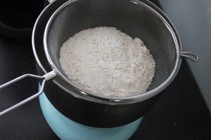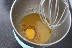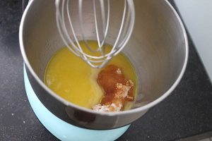 2. Smelt de boter en giet daarna al roerend in de kom bij de suiker. Mix de 2 eieren erbij totdat het een egaal mengsel is. Meng de bloem en bakpoeder in een kom en zeef daarna bij het natte mengsel. Mix het samen kort totdat alles goed gemengd is.