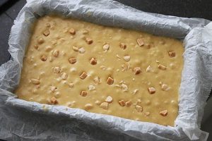 3. Hak de macadamia grof en snijd de fudge in stukjes. Neem een pannenlikker of houten lepel en schep alle macadamia en een groot gedeelte van de fudge er door. Giet het mengsel in de bekleedde bakvorm. Verdeel de laatste stukjes fudge er over (en eventueel wat stukjes witte chocolade).