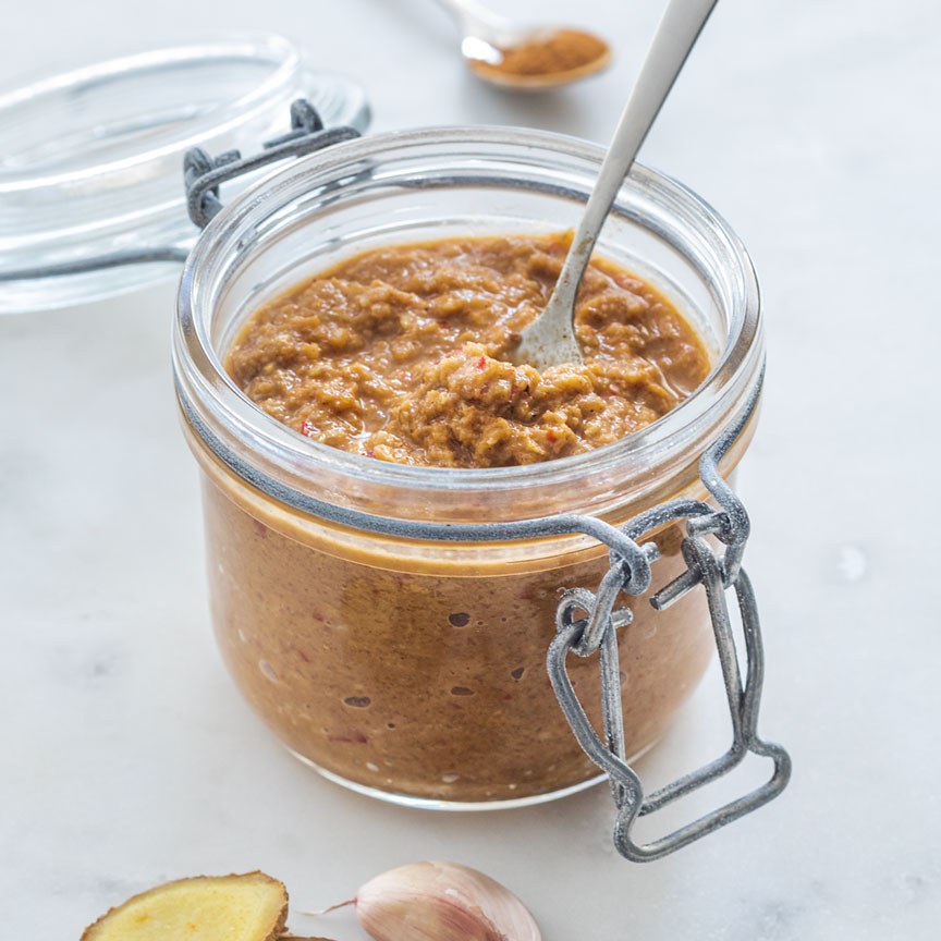 1. Hak de uien, knoflook en gember grof en doe in een keukenmachine. Voeg de macadamianoten toe en hak dit kort doorelkaar. Voeg de kruiden zoals loas, korianderzaad, kaneel, komijn, kruidnagel en de rode peper toe. Mix door elkaar tot een puree, je kunt deze naar smaak heel fijn of wat grover laten.