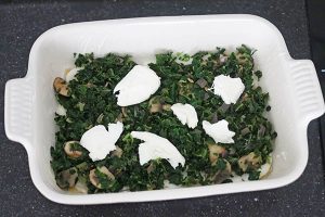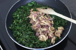 1. Verwarm de oven op 200 graden. Snipper de ui en knoflook en fruit deze in een pan met de eetlepel boter. Voeg de champignons toe en bak een paar minuten mee. Voeg daarna de boerenkool toe en roerbak tot hij iets geslonken is. Breng de groenten op smaak met een beetje peper en zout.