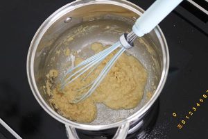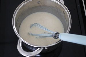 2. Maak de bechamelsaus. Smelt 50 gr boter in een pannetje. Voeg de bloem toe en roer door elkaar tot een roux. Giet beetje bij beetje de melk erbij en roer met een garde door elkaar tot een gladde saus. Laat een paar minuten indikken. Breng de saus op smaak met peper en zout.