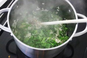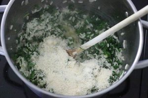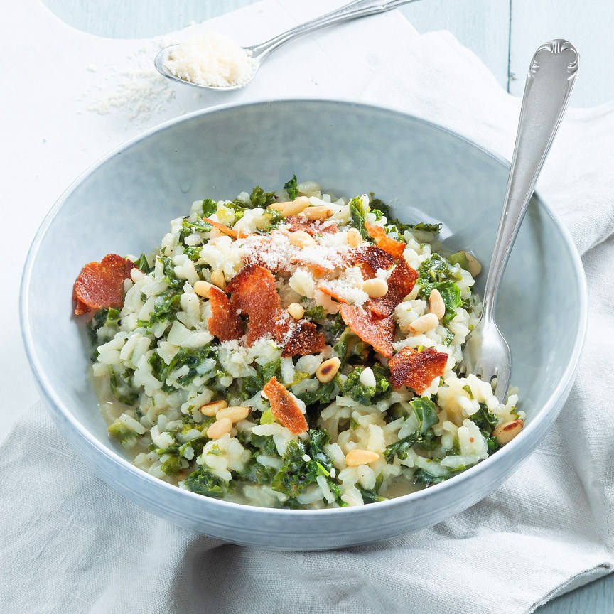 2. Na in totaal ongeveer 25 minuten zachtjes koken is de risotto klaar. Proef of deze gaar is maar nog een kleine bite heeft, je wil geen prutje. Roer dan een klontje boter en de kaas er door. Serveer de boerenkool risotto met wat verkruimelde krokante salami en pijnboompitten en eventueel wat extra kaas.