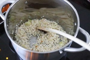 1. Verwarm een pannetje met 500 tot 600 ml water en laat hier het bouillonblokje in oplossen. Snipper de ui en knoflook fijn. Fruit aan in een pan met een beetje olie. Voeg na 2 minuten de risottorijst toe en roerbak even mee. Blus af met een scheutje witte wijn. Als deze is opgenomen voeg je ongeveer een soeplepel bouillon toe. Laat ook deze opnemen door de risottorijst en roer af en toe door. Voeg dan de boerenkool toe en laat slinken door de rijst. Voeg tussendoor ook de bouillon beetje bij beetje toe. Het kan zijn dat je een beetje bouillon over houd. Bak ondertussen de salami krokant in een droge koekenpan en laat uitlekken.