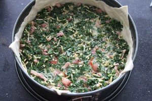 Het is een fijn recept, vooral met koude dagen. Ik doe alleen eerst boerenkool en spekjes op het deeg en daarna giet ik eiermengsel erover.
