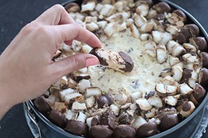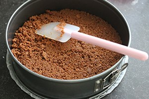 4. Doe dit mengsel in de springvorm en druk aan met een lepel. Zet de vorm zolang in de koelkast.