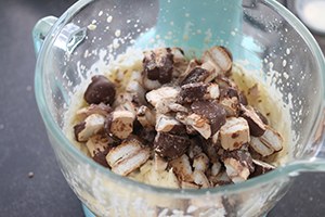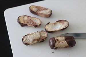 7. Snijd de overgebleven bokkenpootjes in stukjes (bewaar eventueel een hele voor decoratie) en schep ongeveer ā…” door de slagroom.