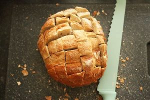 2. Snijd met een groot broodmes het brood aan de bovenzijde om de ca. 3 cm in. Doe dit dwars en recht zodat er vierkantjes ontstaan.