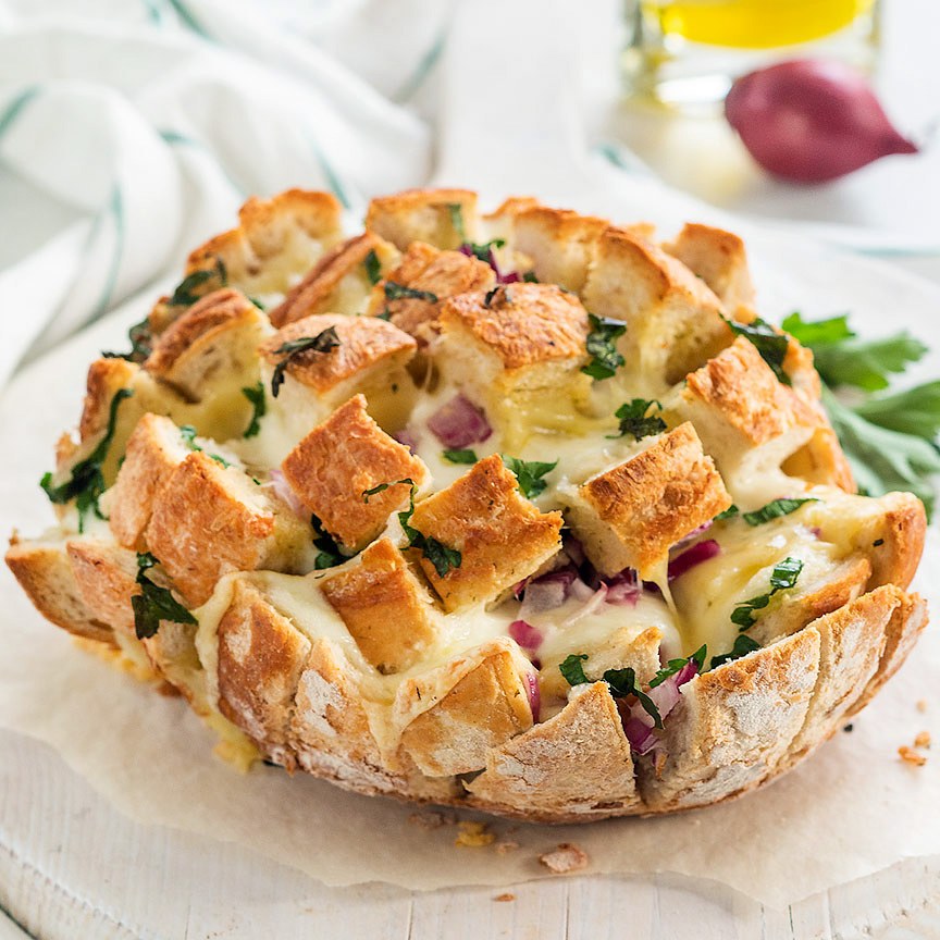 7. Serveer direct op tafel op een borrelplank, zo kan iedereen er plukjes brood vanaf trekken.