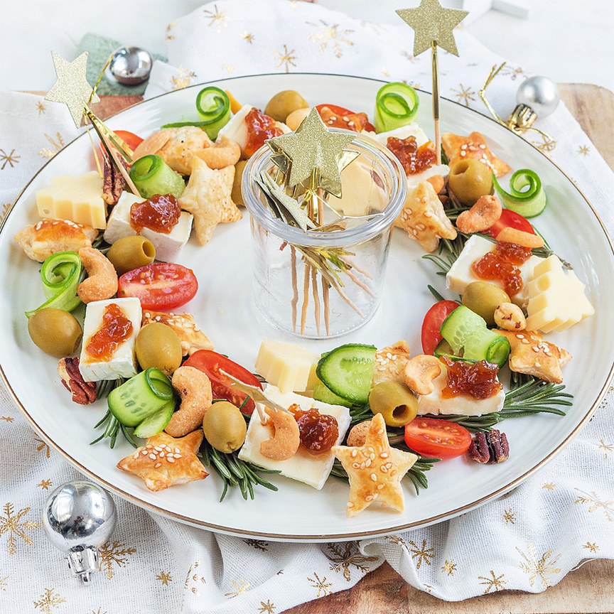 8. Verdeel de tomaatjes, olijven, komkommerrolletjes, bladerdeegsterren, blokjes kaas (ook leuk om uit te steken met een vormpje) en noten over de feestelijke borrelkrans.
