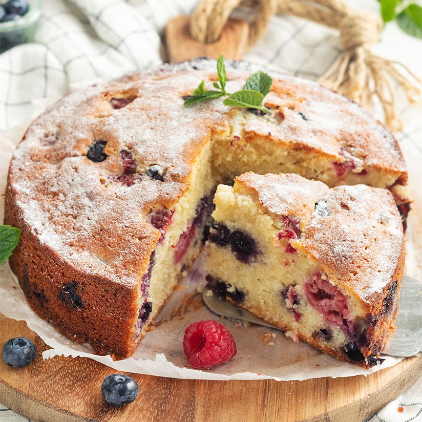 8. Controleer met een satéprikker of de bosvruchten cake gaar is vanbinnen. Laat hem daarna afkoelen. Bestrooi de bosvruchtentaart met een beetje poedersuiker en serveer bijvoorbeeld met een toef slagroom.