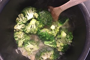 1. Snipper de ui en fruit deze aan in een grote soeppan. Voeg daarna de broccoli en de groentebouillon toe. Doe ook alle kruiden erbij. Breng aan de kook en laat 10 minuten koken. Voeg de laatste 2 minuten de spinazie toe.