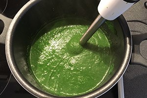 Pureer het geheel met een staafmixer. Voeg de kokosmelk toe zodra de soep gepureerd is en roer goed door.