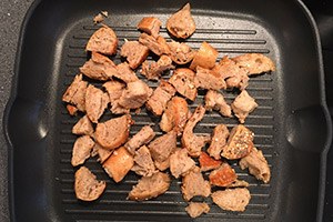 2. Doe een scheut olijfolie in een kommetje en pers 2 teentjes knoflook hierin uit. Snijd het broodje in kleine stukken en smeer deze in met het olijfolie-knoflookmengsel. Neem een grillpan en grill het brood totdat de stukjes knapperig zijn worden.