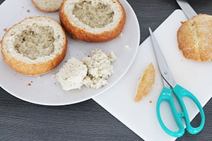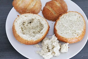 3. Steek de oren met een prikker bovenop de zachte broodjes. Vul het harde broodje met de soep. Serveer direct anders bestaat de kans dat het broodje zacht wordt.