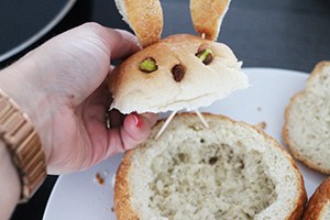 2. Snijd een kapje van de bovenkant van de harde broodjes. Knip of snijd hier 2 oren uit. Hol het broodje uit. Steek de pistachenootjes en rozijnen in de zachte broodjes als een gezichtje. Maak de zachte broodjes vast op de rand van het harde broodjes met wat prikkers, snijd eventueel iets van de onderkant af.