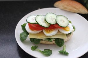 2. Snijd de broodjes open en besmeer de boven en onderzijde met wat kruidenroomkaas. Beleg de onderste helft met wat sla, kaas, plakjes ei, komkommer en wat kiemen. Bestrooi met een snuf peper en dek af met de bovenste helft en zet eventueel vast met een prikker.