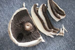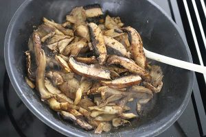 3. Verhit een beetje olie in een koekenpan en bak de gekruide paddenstoelen ca. 5 minuten tot ze wat geslonken en gebakken zijn.