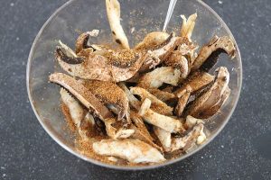 1. Snijd de portobello’s in reepjes en de oesterzwammen in stukken. Doe ze in een kom en voeg de sojasaus en shoarmakruiden toe. Pers de teen knoflook erbij en meng door elkaar.