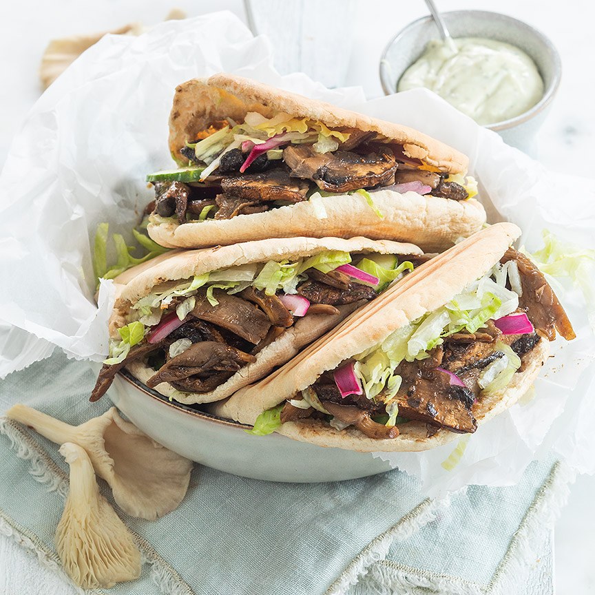 4. Snijd de broodjes open. Vul ze met sla, plakjes komkommer, rode ui en de paddenstoelen shoarma. Serveer met wat knoflooksaus.