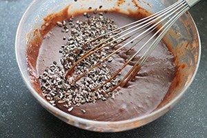 1. Meng de bloem, cacao, bakpoeder, zout en suiker door elkaar in een kom. Voeg de gesmolten boter, vanille aroma en eieren toe en meng met een garde tot een glad beslag. Schep dan de cacao nibs er door, deze geven een lekkere crunch. Laat het beslag ca. 20 minuten staan.