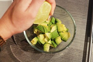 5. Snijd de avocado in kleine stukjes en meng met het sap van de limoen en een snufje peper.