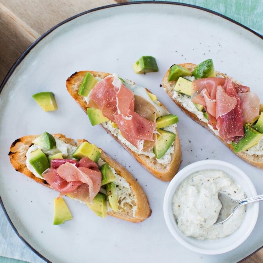 6. Besmeer de broodjes met het pesto-mengsel en schep er wat avocado op. Leg op ieder broodje een plakje parmaham.