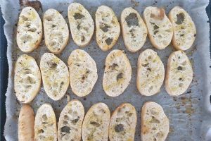 7. Snijd het brood in plakken en verdeel deze ook over een bakplaat met bakpapier. Verdeel hier ook wat olijfolie, zout, peper en oregano overheen. Grill ze totdat ze licht verkleurd zijn.
